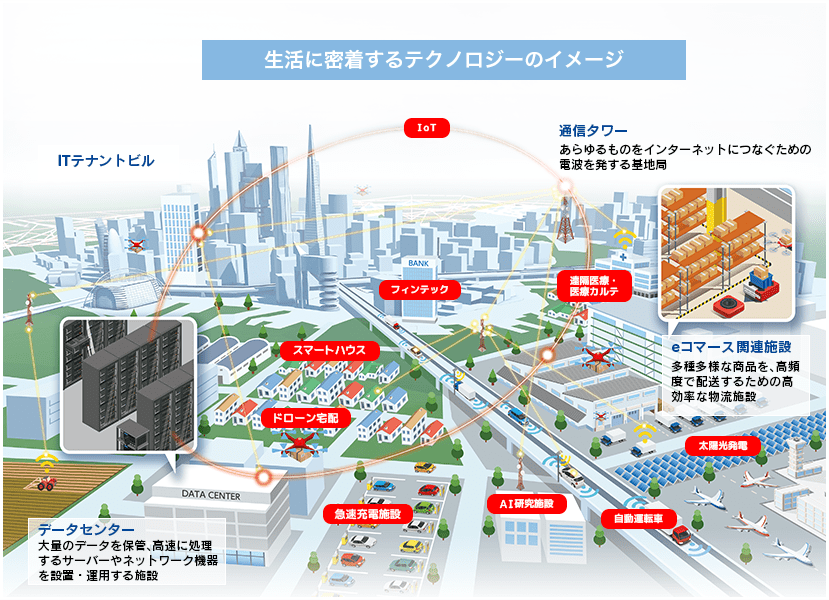 IoTやモバイル端末の普及、5G等の無線通信の大容量化・高速化により、通信施設に対する需要が拡大