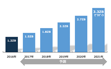 【世界の通信量の推移】(2016年~2021年) (出所)Cisco「Visual Networking Index:予測と方法論、2016年~2021年」よりパインブリッジ・インベストメンツが作成